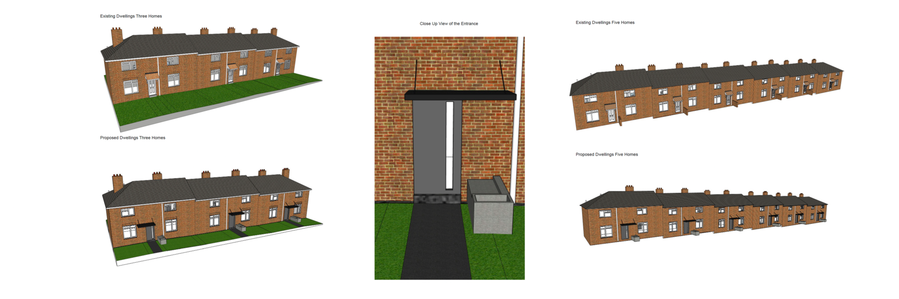 My work on this project was creating the 3D model of the homes in SketchUp. The model was created using the elevation and floor plans of the buildings, adding details such as windows, doors, porticos, chimneys, rainwater pipes, and flues. After that I found examples of modern porticos and used them as inspiration for creating a new design in SketchUp. Working on this project helped me to improve my SketchUp skills and gain a better understanding of the software. I also learned about retrofit projects, about different renders and claddings used such as brick slips and what it means to design with a ‘fabric first’ approach.