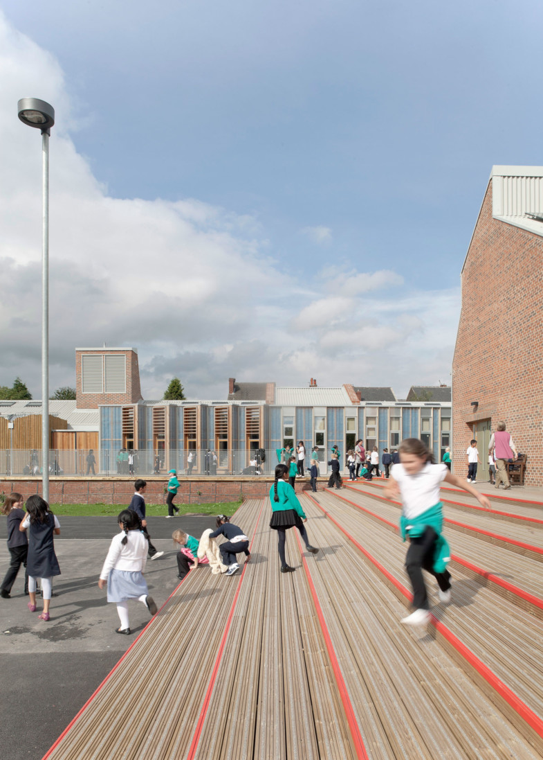 In surrounding Sandal, the quiet back lanes between the red brick terraces become the playground for children’s imaginations. The school design replicates this relationship with ‘streets for kids’: easily supervised outdoor rooms where all classes and age groups can mix in the hustle and bustle of playtime.